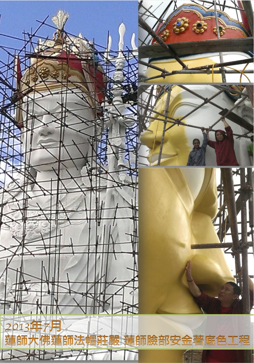 尼泊爾蓮師大佛開始臉部安金著底色了